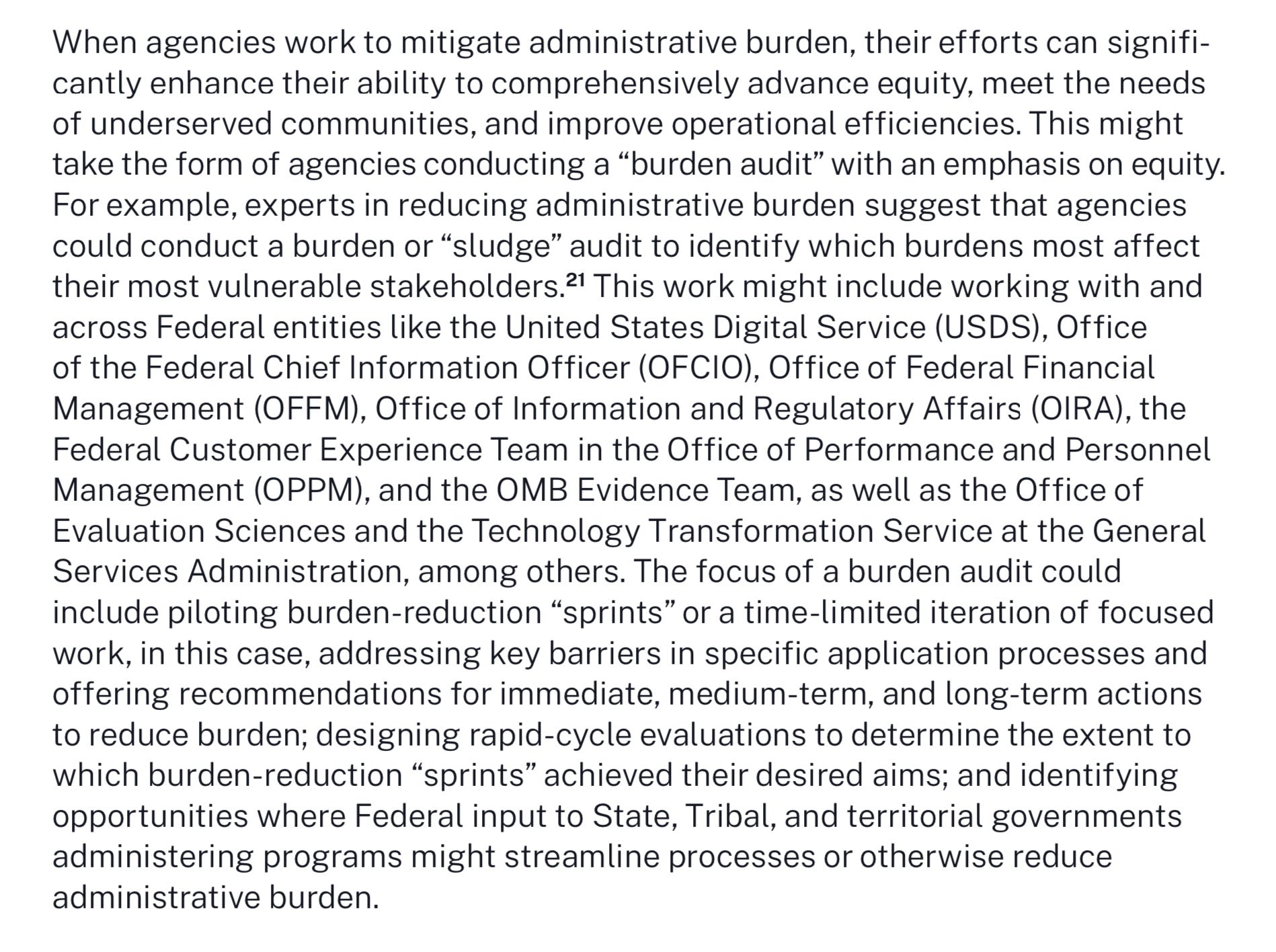 I’ve been studying the topic of administrative burdens for over a decade now. It is fair to say that Biden is thinking about the ways in which administrative burdens limit access to valued public services more than any prior Presidency of the modern era. Indeed, what the Biden administration is doing represents the most coherent governmentwide effort to identify and reduce burdens for regular members of the public I have seen any government pursue. It is offering a framework to push bureaucrats to think about ways in which they impose costs on members of the public and offers some tools to fix this problem.