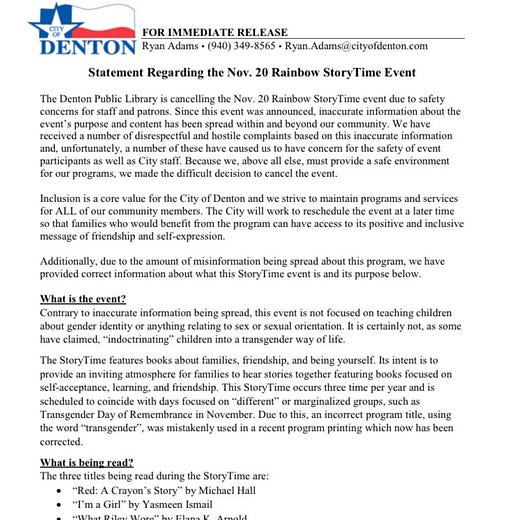 Terrified officials are setting aside their professional judgment. This is the same culture of fear that led school officials in Texas to discuss both-sidesing the Holocaust to avoid offending anyone. (Which offended everyone). It’s the same culture of fear that has saw librarians in Texas cancel book reading events.
