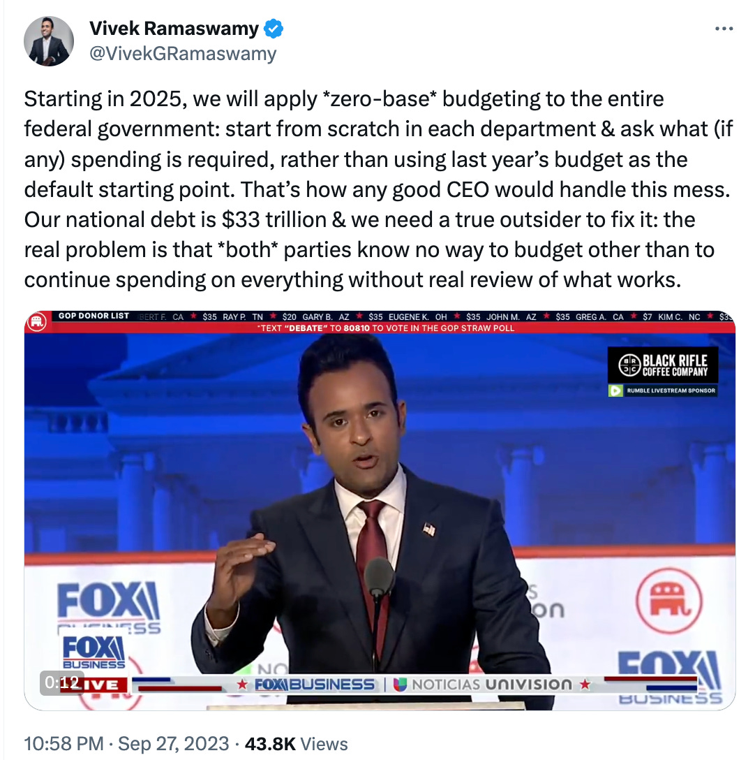 At the second Republican debate, Vivek brought to the national stage an idea he has been trotting out on the stump: Zero based budgeting.