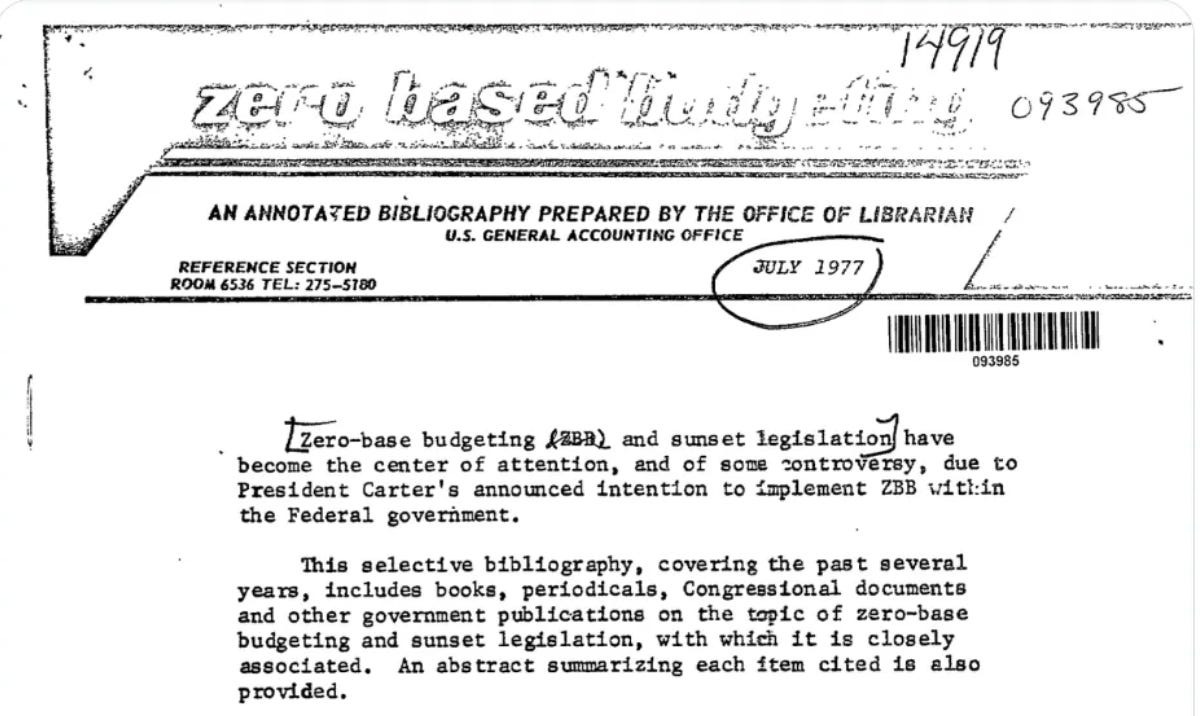ZBB is one of those zombie ideas that refuses to die, despite a clear record of never working anywhere in government. Reagan abandoned it as soon as he became President. Occasionally, states will say they are doing ZBB, but if you look closely they are not (they might ask units to present 10% cuts and call it ZBB). They drop it when it becomes too absurd. I wrote a little about this in my book, The Dynamics of Performance Management pointing to the idiocy of ZBB. Texas literally printed a budget book with rows of zeros where previous allocations had once been: “As the document was distributed, budgeteers quietly ignored it and returned to the actual process of allocating resources by looking at how they had done so in the past.”