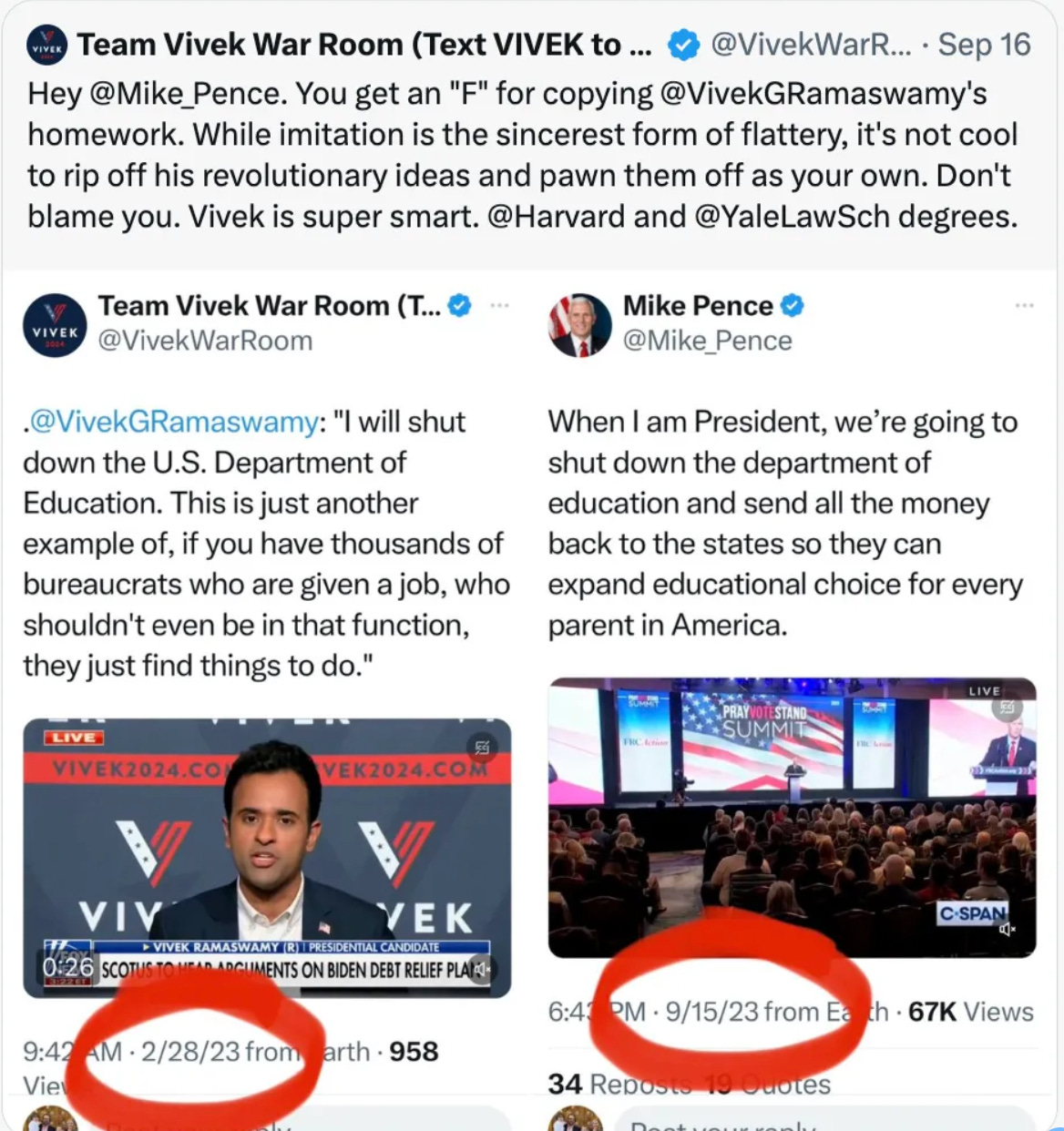 Side note: It is funny that Vivek acts like he is the first person who came up with the of shutting down agencies, specifically the Department of Education. Ronald Reagan called for shutting down the Department of Education as soon as it was created, and its been a perennial right wing goal ever since. And indeed, a 19th century version of the Department of Education was eliminated, by racists seeking to ensure that the Department would not monitor and report on the failure of southern states to keep their post civil war commitment to provide education to Black children. What a legacy to aspire to!