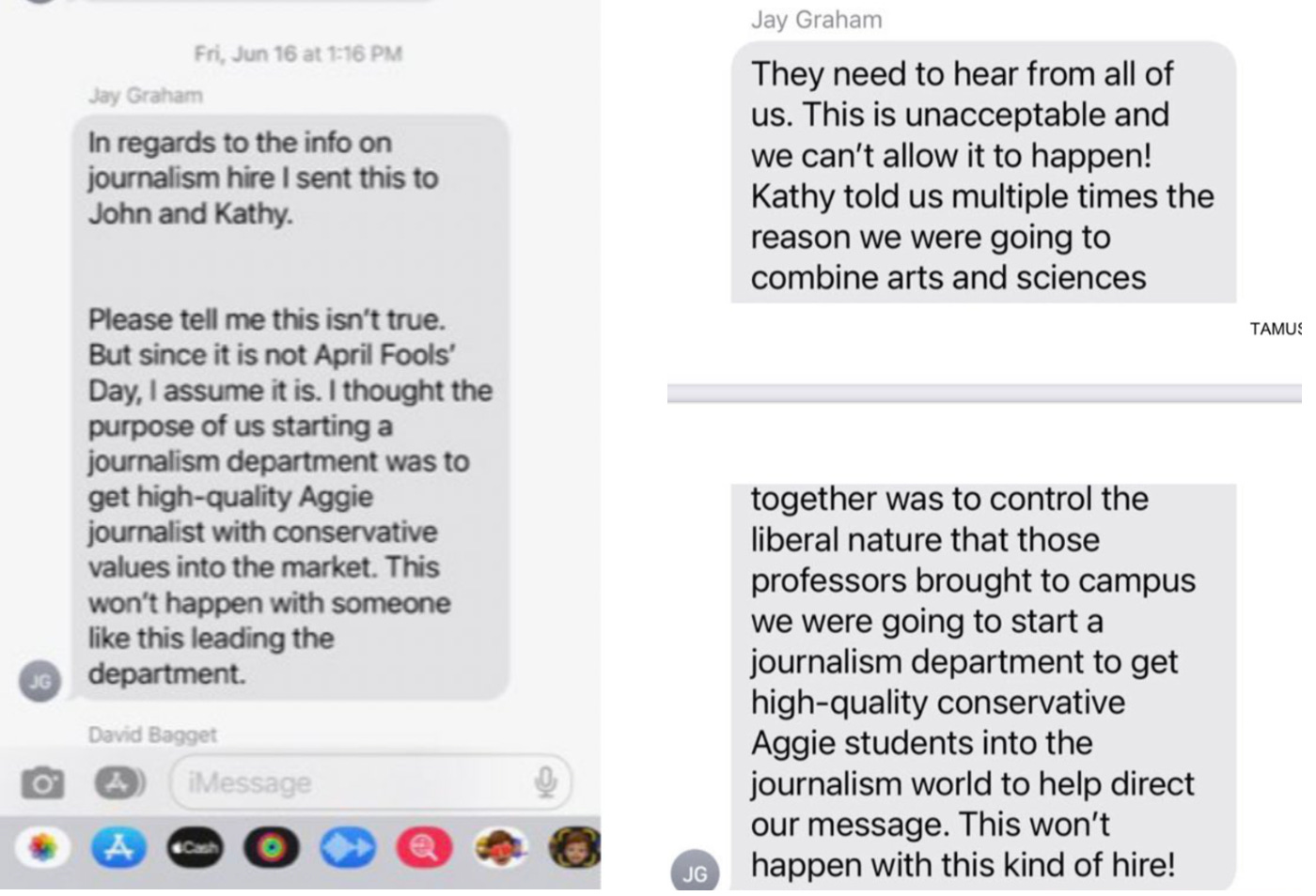 In texts with his fellow regent David Bagget, Jay Graham indicated that he told university leadership that he “thought the purpose of us starting a journalism department was to get high-quality Aggie journalist[s] with conservative values into the market.” He also indicated that A&M President “Kathy [Banks] told us multiple times the reason we were going to combine arts and sciences together was to control the liberal nature that those professors brought to campus. This won’t happen with this kind of hire.”