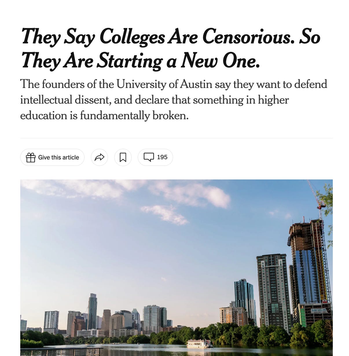 A while back Bari Weiss declared she was setting up a university - in Texas - to fight campus censoriousness. She got a lot of free media for this claim. See the headline below from the New York Times for example.