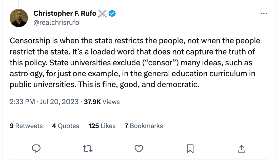 The view of censorship advocate Chris Rufo sums up this point quite nicely. Censorship of faculty is fine, good and democratic, since they are not people. Rufo is a master propagandist, at least if you never stop for a moment to think through the Orwellian logic he is persuading politicians to adopt. For example, Rufo’s views are not meaningfully different from the state of Florida, whose lawyers have argued in court that faculty have no right to hold a view contrary to state positions, and they can be fired for expressing such contrary views.