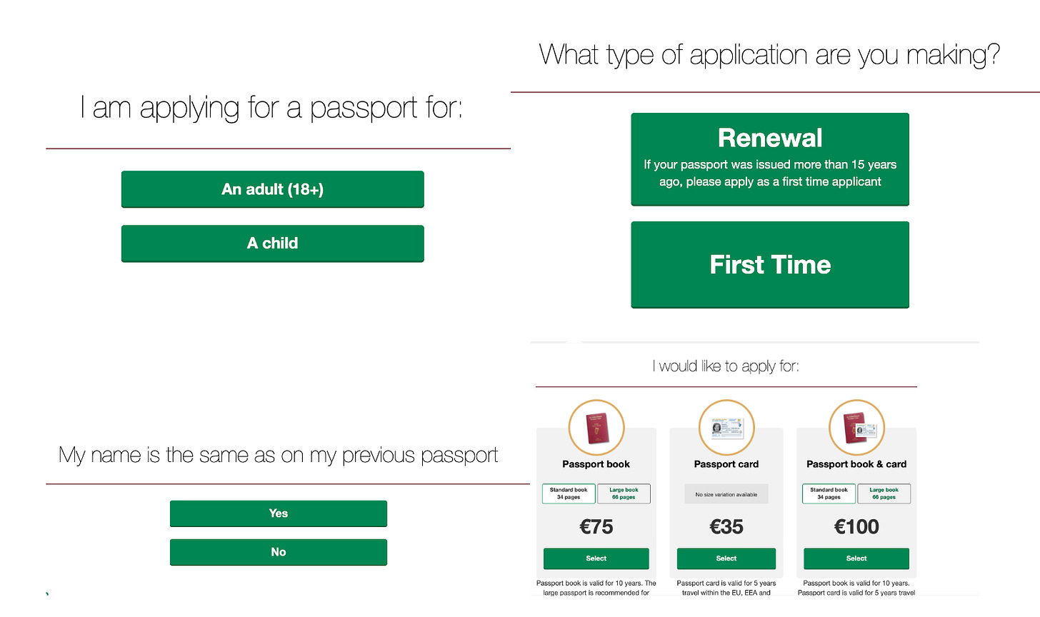 This experience reminded me that my Irish passport was expiring, and needed to be renewed. Which took me about 20-25 minutes all in, done entirely online. And half of that time was getting my kid to take a photo on my phone, and figuring out how to save that photo as a jpeg. There was no form to fill in, and no documentation to provide. I clicked through a series of intuitive questions, uploaded the photo (which was rightsized to the appropriate dimensions automatically), entered my old passport information, my address, and paid. It was extraordinarily easy. The passport arrived, from Dublin to the USA, 10 days later.