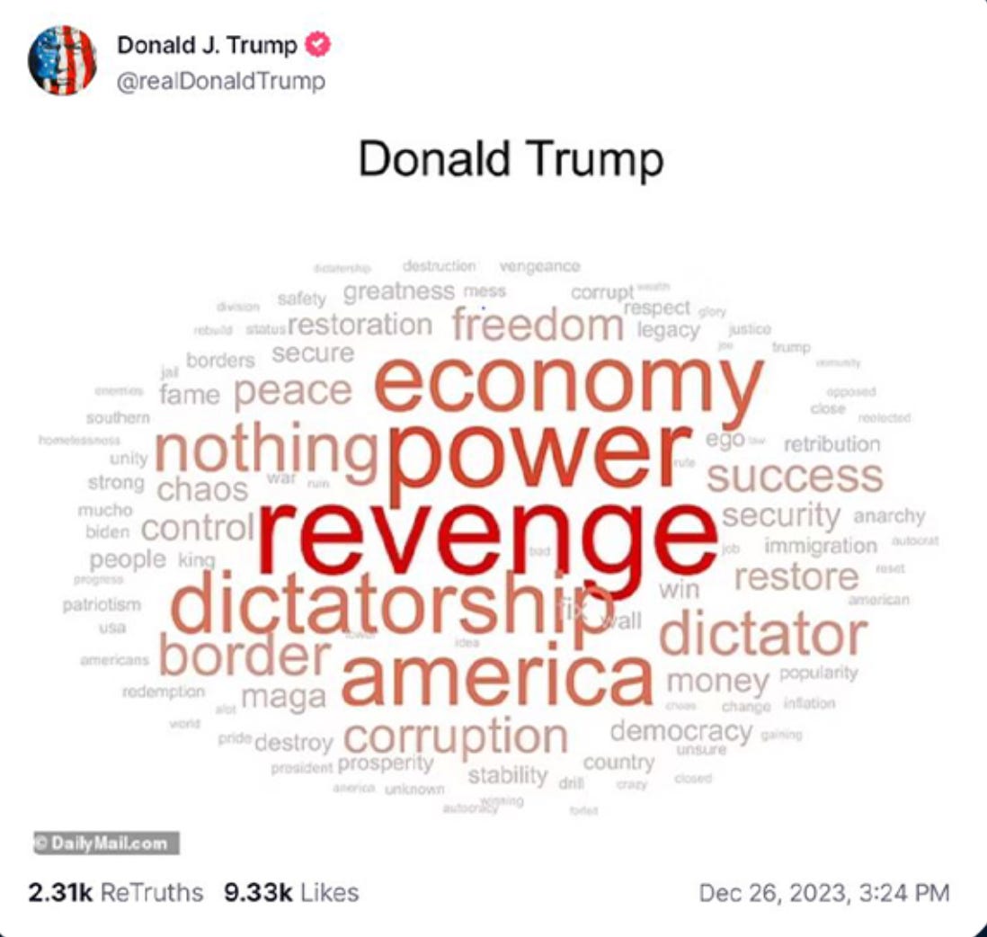 Far more than his first and second campaigns, Trump has made vengeance the central theme of his re-election platform, even reposting an wordcloud analysis of his campaign speeches that highlighted this theme.