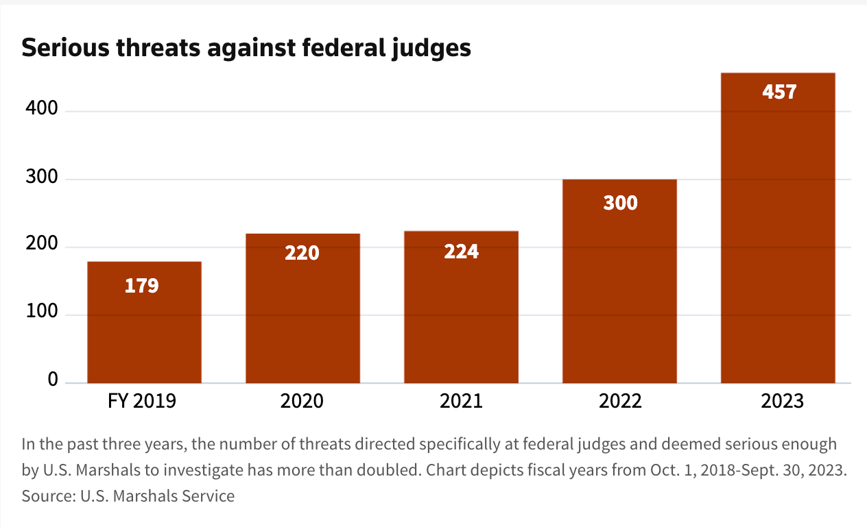 The US Marshals service has reported a massive increase in serious threats against federal judges between 2021 to 2024, as Trump’s legal woes escalated. The head of this unit notes that “we would see a noticeable uptick in threats directed at whatever judge had the case” when Trump was in court.