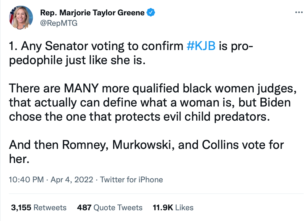 I wrote in The Washington Post about what happened next. Multiple Senators made child sex abuse the central theme of the SCOTUS hearings. Republicans labeled even other Republicans who committed to support Jackson as “pro-pedophile.” “Grooming” has exploded as an all purpose smear on the right.