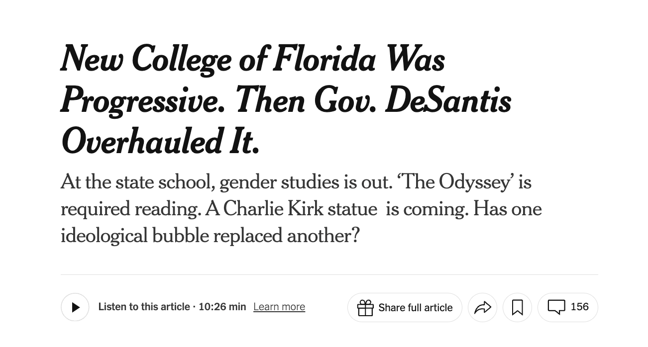 Most reporting on New College give the impression of a fuck-around-and-find-out example about what happens when right-wing ideologues actually run things, and then run them into the ground. But the New York Times is determined to throw New College a lifeline.