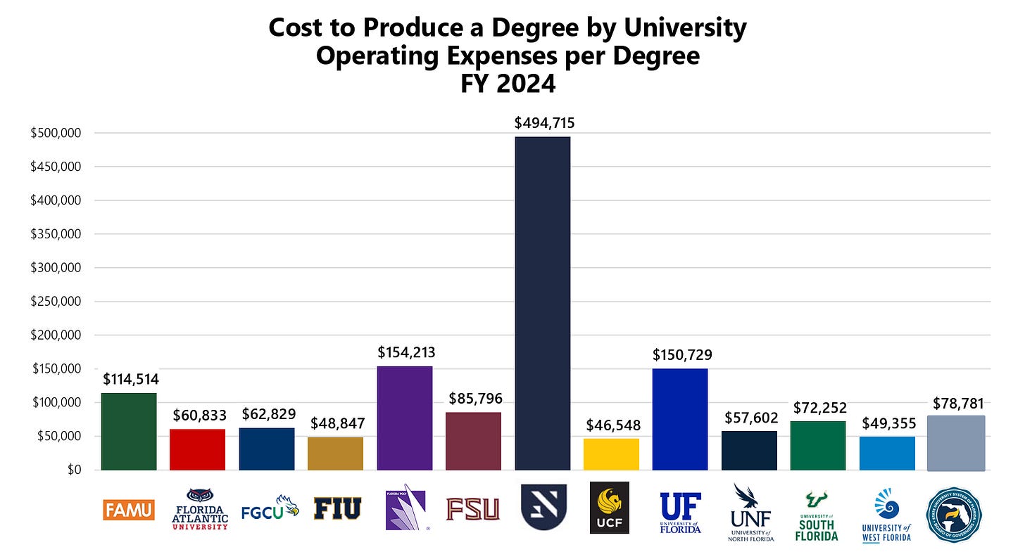 An analysis from DeSantis’s own DOGE commission found that New College cost about four times the average per student cost. New College is similarly a large outlier when it comes to cost per degree. None of this is mentioned in the Times coverage.