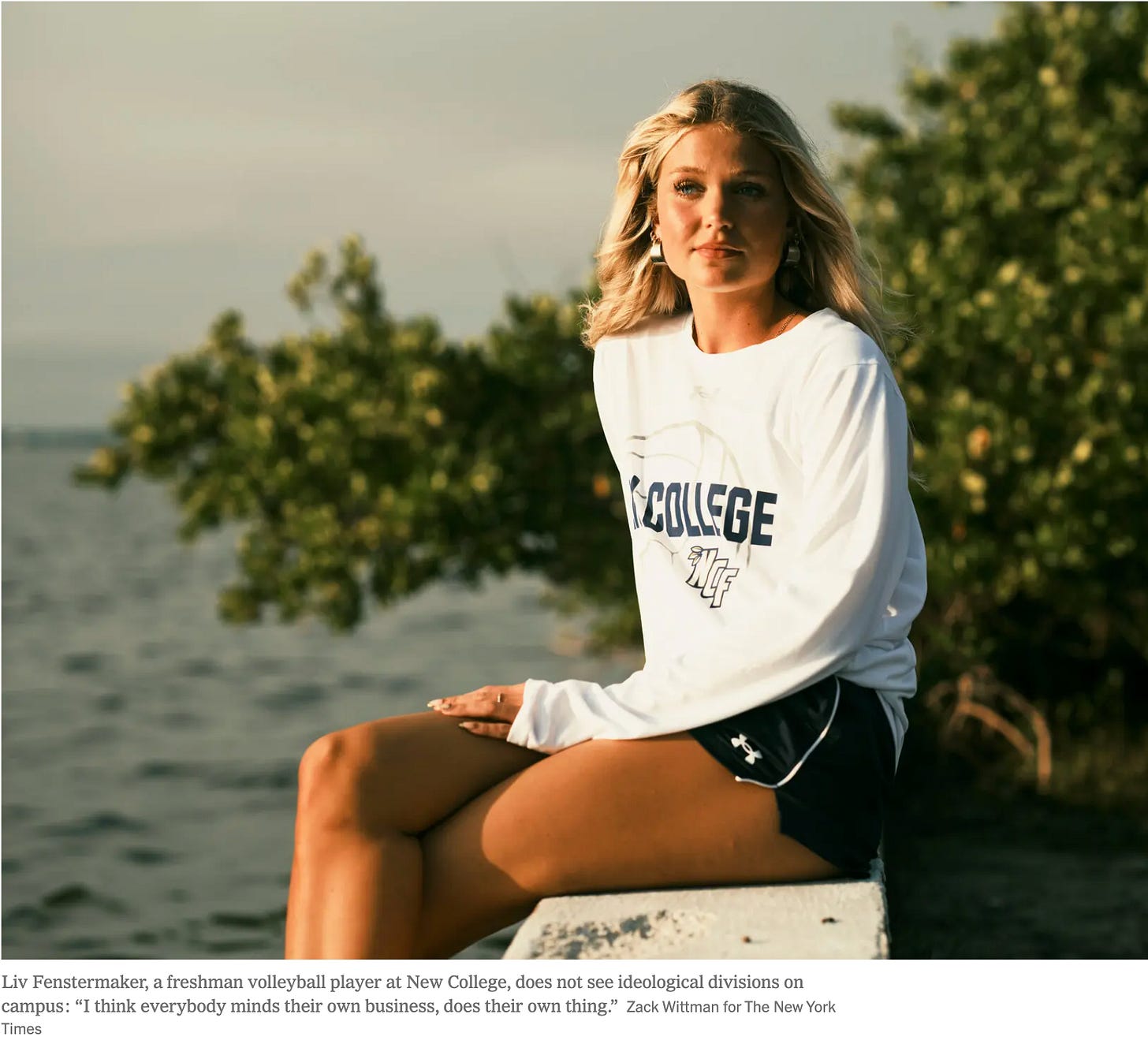The pivot to athletics allows New College leadership to draw a line under its reputation as being a haven for nonconformists, and instead to post images of an idealized college student. New College brochures can’t be sent to everyone, but the Times can fill in the gap with images like this: