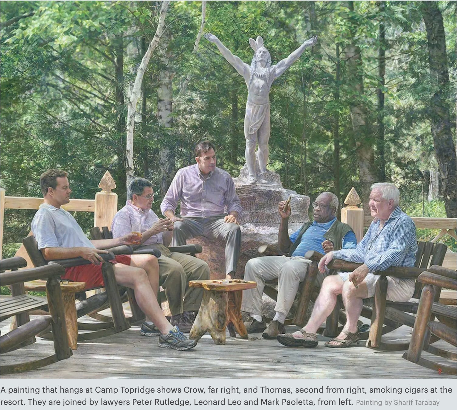 Take for example a painting that hang’s in Crow’s Adirondacks estate. It features Thomas, Crow, and also Leonard Leo, who has spent decades reshaping the American judicial system, converting private money into public policy by building the Federalist Society and exerting significant influence about which conservatives will make it to SCOTUS. It also features Mark Paoletta, a Thomas family friend who was a general counsel at OMB in the Trump era. That definitely seems like a group who might care about court decisions! Paoletta was accused of ignoring DOD warnings of the illegality of Trump’s withholding aid from Ukraine that led to Trump’s first impeachment, and then misleading Congress about what happened. (Paoletta was also on the Indonesia junket with Thomas, yet pushed back against any suggestion that SCOTUS ethics rules were too lax; instead he blamed declining confidence in the courts on a coordinated campaign by “Democrats and their allies in the corporate media”).