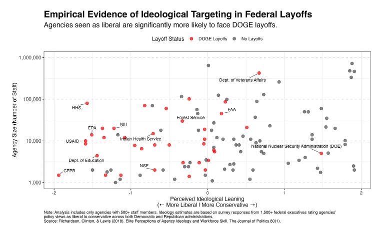 The negative coefficient for ideology (-0.230) confirms that agencies perceived as more liberal (lower scores on the ideological scale) face significantly higher probabilities of layoffs. In fact, it is by far the strongest predictor. Agency size had no significant effect, while budget had only a modest influence…The targeting isn't random. The hardest-hit agencies are precisely those that regulate industry, protect public health, and expand access to education. Meanwhile, conservative-leaning agencies remain largely untouched. If efficiency were truly the goal, we would expect an even spread across the ideological spectrum. Instead, we see a clear ideological bias.