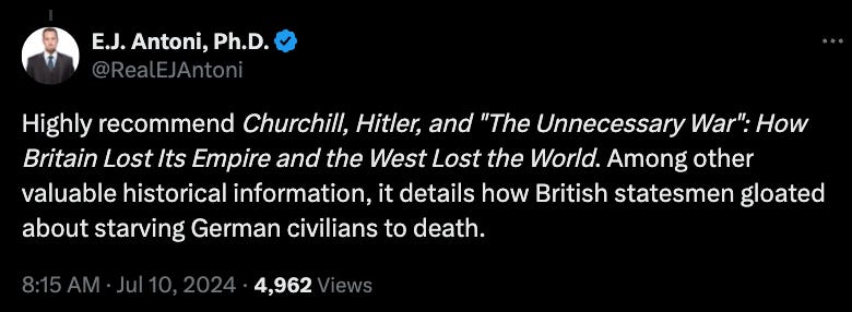Indeed, Antoni appears to be part of the far right movement that blames Churchill for pursuing World War II.