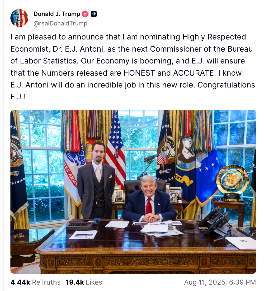 E.J. Antoni has experienced a meteoric rise. President Trump nominated him to lead the Bureau of Labor Statistics, America’s most prestigious producer of economic data, just five years after he completed his PhD at Northern Illinois University. His C.V. is untroubled by citations attesting to his influence, peer reviewed publications, or relevant experience for the job.