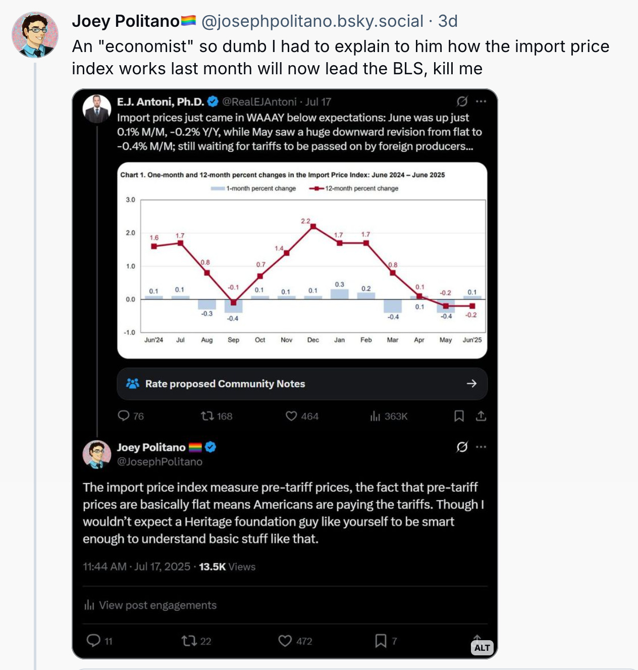 Antoni shares his economic insights online, which sometimes leads other researchers to correct his misrepresentations/misunderstandings in ways that should be truly disqualifying: