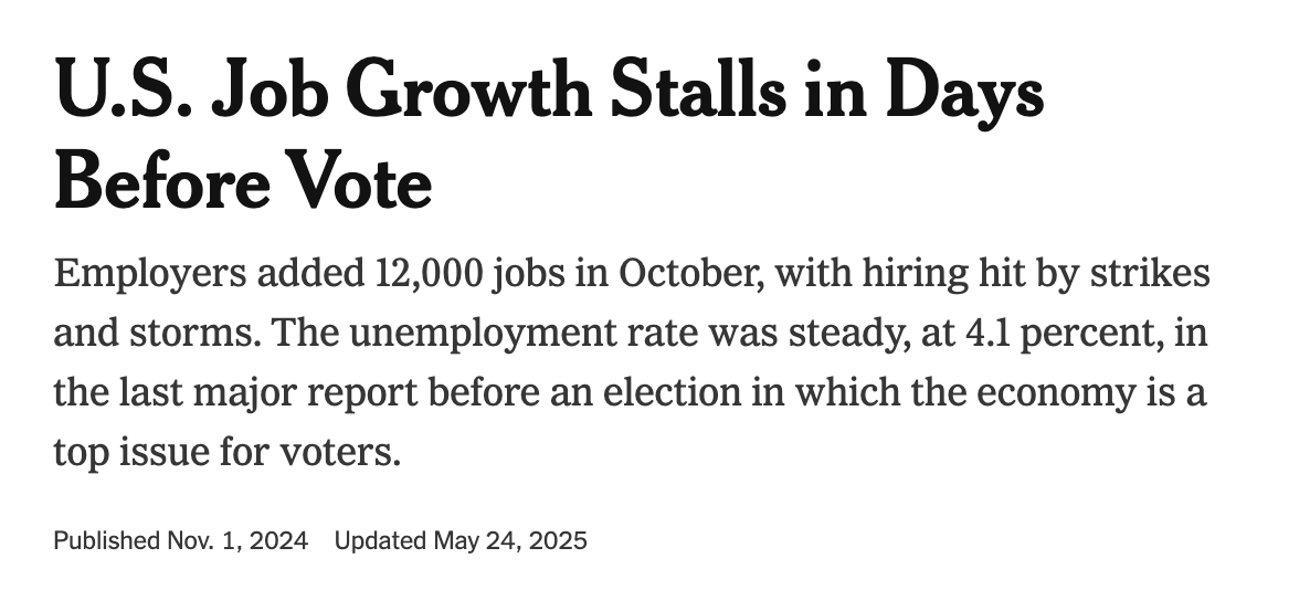 The claim that the BLS delivered positive numbers to help Harris right before the election is also false. It was a weak jobs report, bad for Harris. Here is a headline from the time.