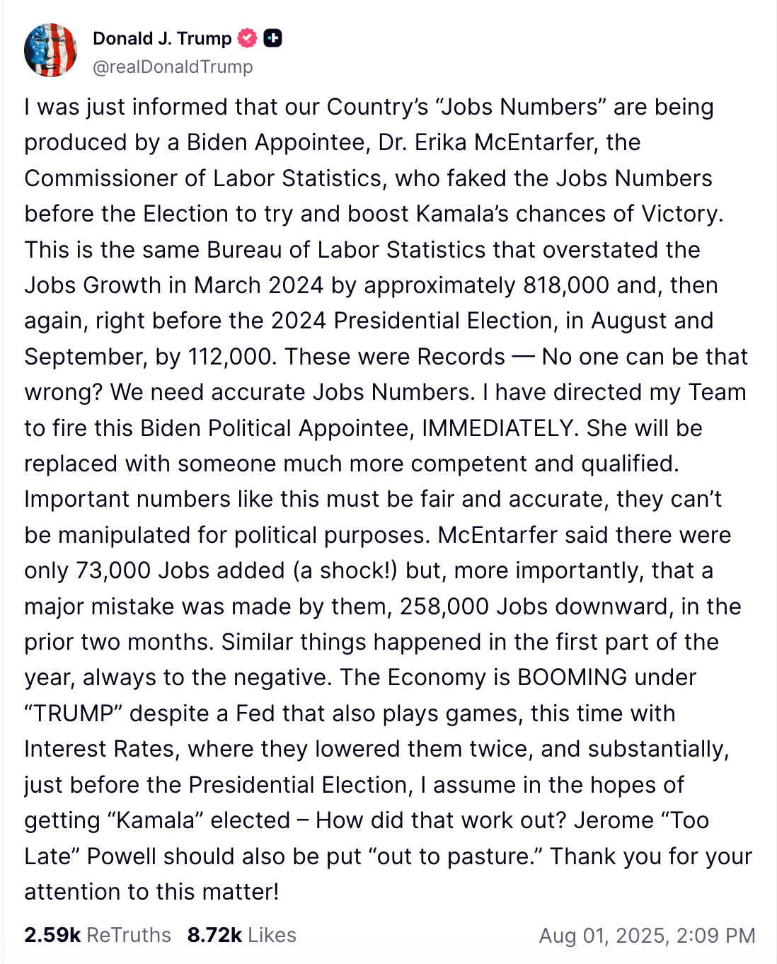 What’s more, Trump gets the basic fact wrongs. He suggests the BLS “overstated the Jobs Growth…right before the 2024 Presidential election.” But the opposite is true. The large downward revisions to job numbers under Biden that Trump refers to —818,000 — happened in August before the 2024 election.