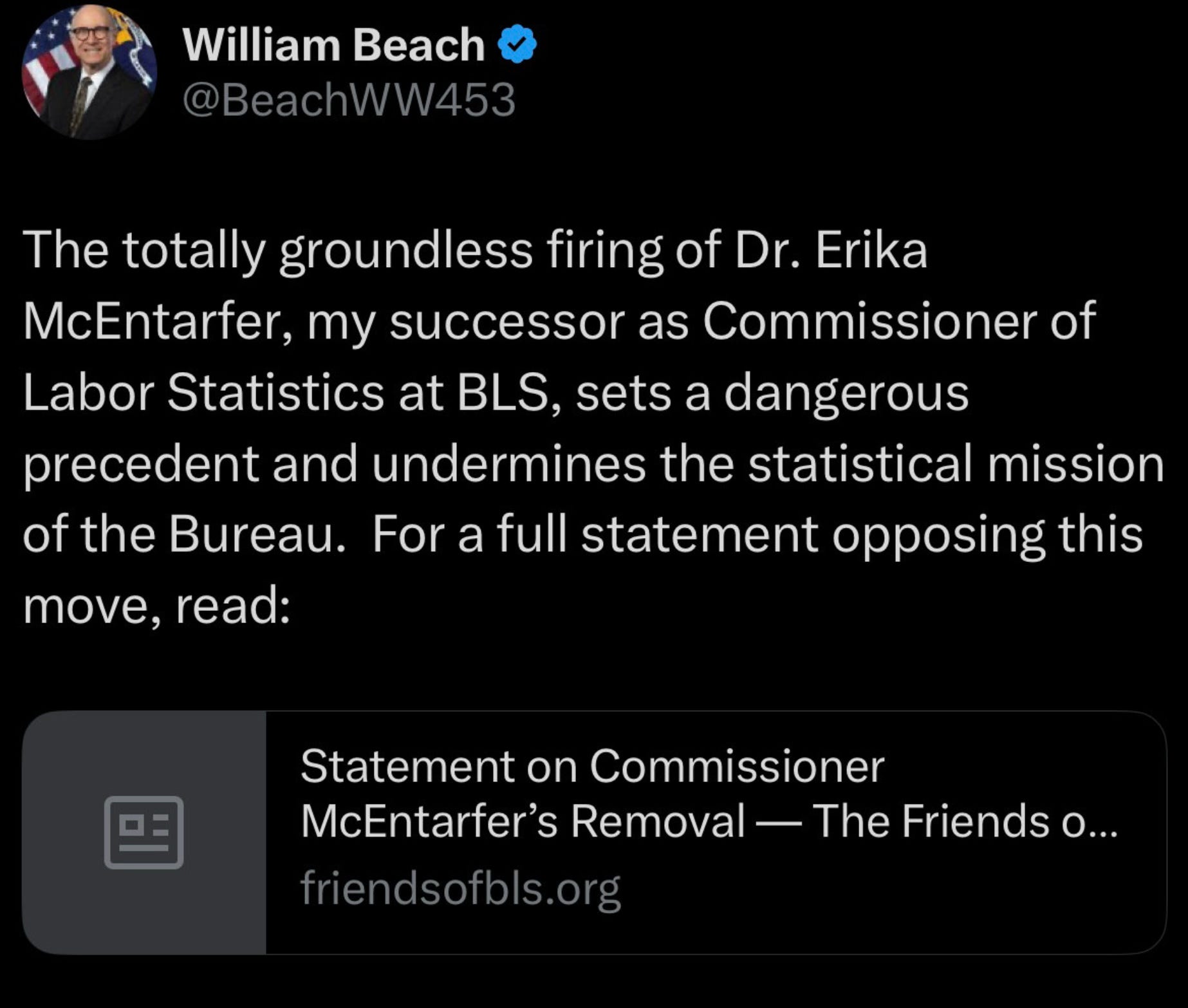 Here is the how Trump’s first pick as BLS Commissioner, William Beach, responded to the news: