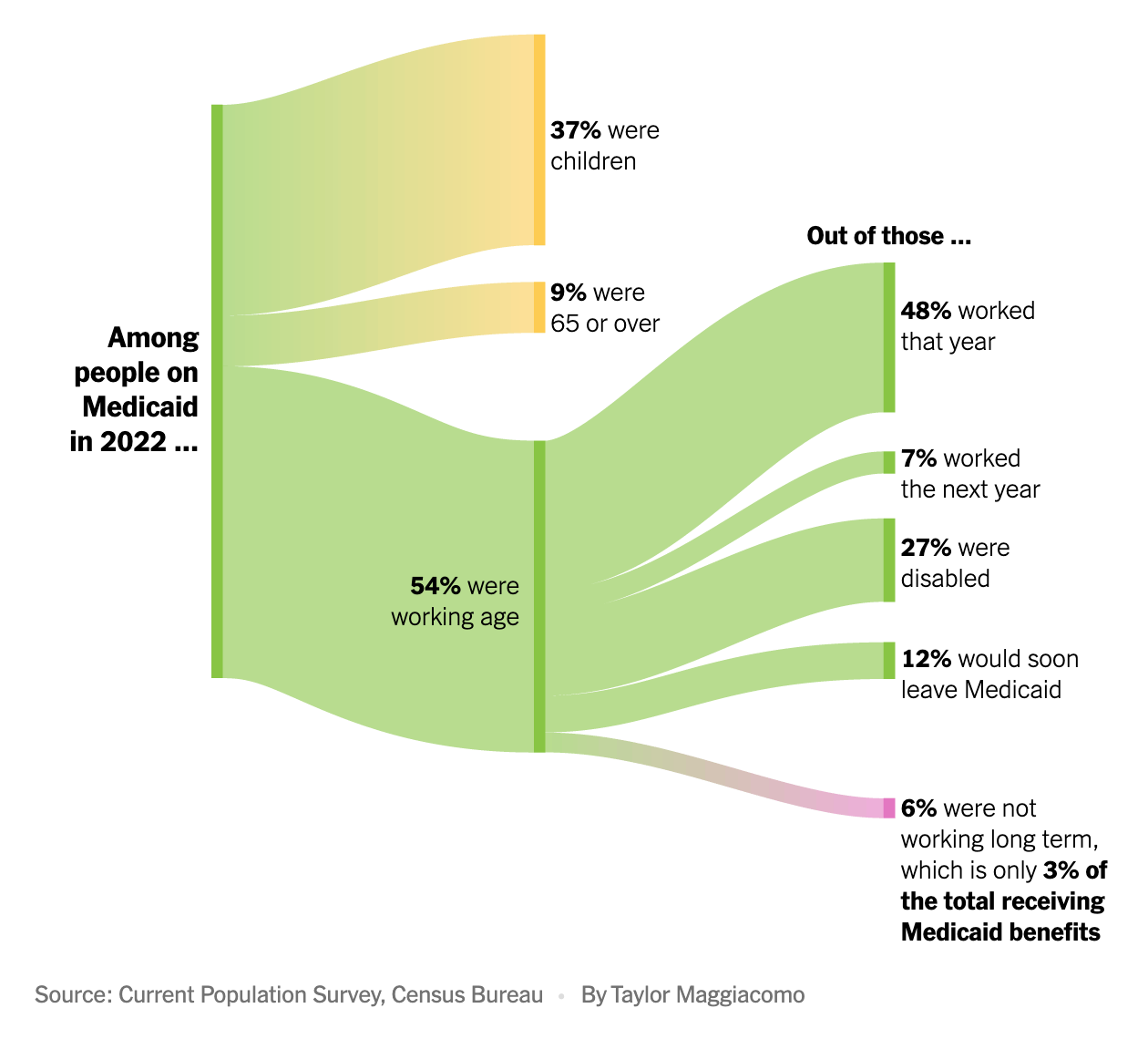 Work requirements have received the most attention, with much of the criticism focused on the ethics of cutting costs by making health care access contingent on employment. But those debates are a distraction from Republicans’ actual goal: pushing eligible people off the program. If you account for Medicaid beneficiaries who are already working — and those excluded from work requirements because of disability or caregiving responsibilities — almost no one should lose coverage. But when Arkansas adopted work requirements in 2018, nearly all of the people who lost coverage had met the requirements. They simply couldn’t manage the paperwork to prove it.