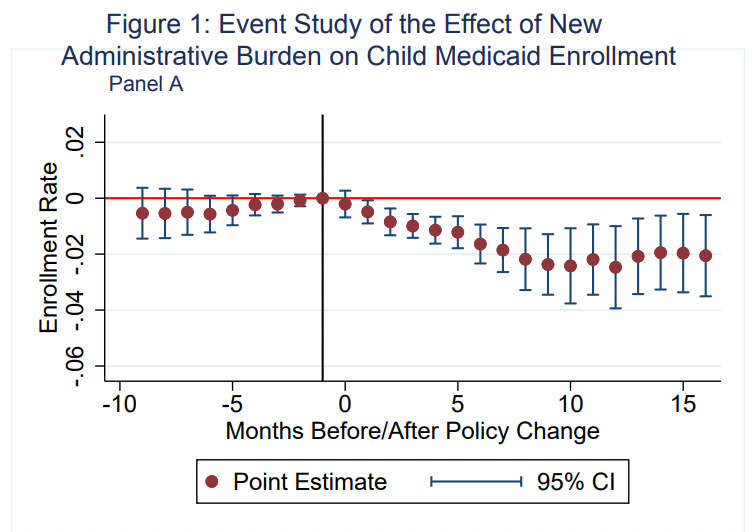 They authors find that "increased administrative burdens placed on families reduced public health insurance coverage by a mean of 5.4 percent within the year following the implementation of these changes."
