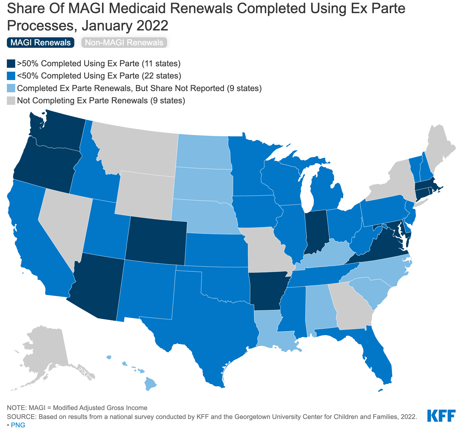 Of course, states know the end of the PHE is coming, and have been required to plan for it. But there are doubts about whether they are doing enough. For example, states could use administrative data to automatically re-enroll people who are clearly eligible ("ex-parte processes”), effectively shifting burdens from applicants and onto the state. But only 11 states report completing 50% or more of renewals using such processes according to data collected in early 2022 by the Kaiser Family Foundation.
