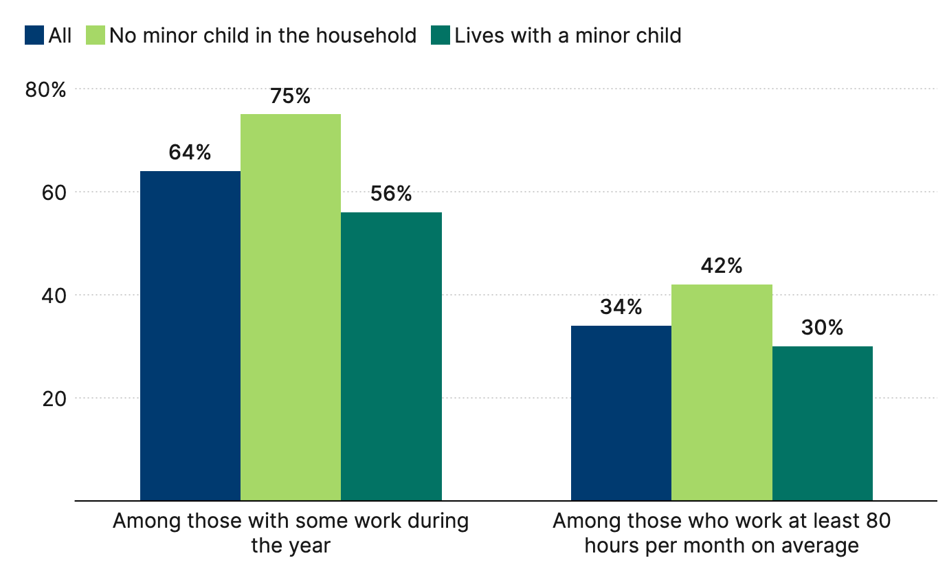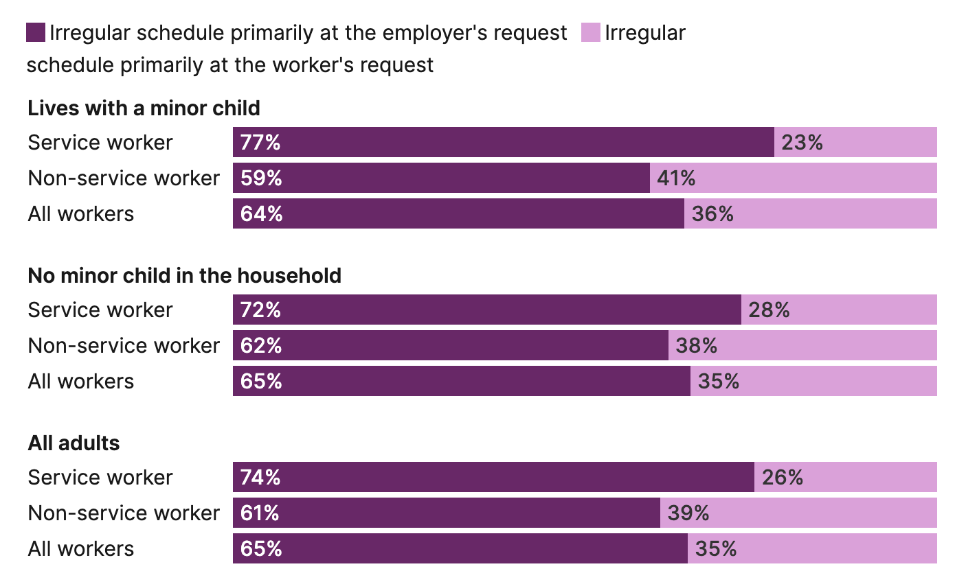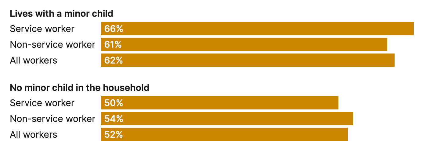 For some adults with care obligations, these months with lower hours could reflect a temporary need to cut back on work in order to focus on family responsibilities. However, the data show that overwhelmingly this volatility is driven by employers’ fluctuating needs, not workers’ preferences. Our analysis of the Survey of Household Economics and Decisionmaking (SHED) shows that some 65 percent of low-income workers with irregular schedules report that the irregularity is primarily at their employer’s request, including more than three-quarters of service workers in households with children (Figure 3).