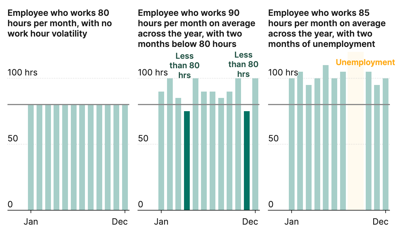 Figure 1. Illustrative examples of how work volatility can cause a worker to fall short of a monthly SNAP work hours requirement