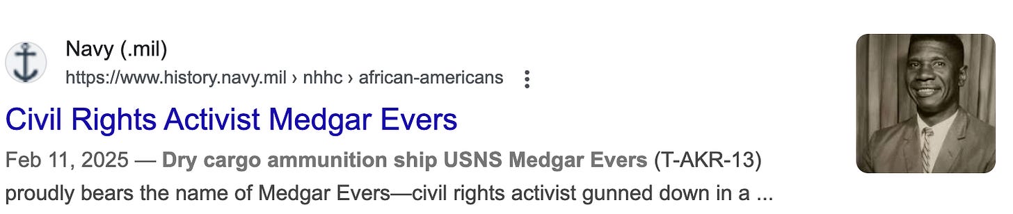 Information about iconic civil rights figures have been removed. The Department of Defense was once so proud of Medgar Evers, the WWII Army veteran who became a civil rights activist until his murder by a white supremacist, that it named a Navy vessel after him. But now the page honoring the name change has been removed “in accordance with DOD instructions 5400.17” — the Pentagon digital media guide that has been updated to remove reference to DEI. A different webpage, about the ship, discusses Evers, but also indicates it has been adjusted to match the same policy.