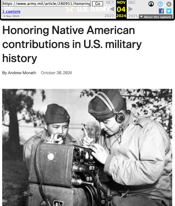 Articles about Native Americans, who enroll in the military at much higher rates than other groups, have been removed. A piece about Ira Hayes, the Pima Indian who was one of the group who raised the flag at Iwo Jima is gone. Axios found that at least 10 pieces about Code Talkers, whose identity was central to their ability to play a crucial role in military intelligence during World War II, have disappeared. DOD Secretary Hegseth has said “I think the single dumbest phrase in military history is ‘our diversity is our strength.’” But the Code Talkers are a simple and unambiguous proof otherwise. They used their tribal language to send intelligence messages in a way that allied powers could not detect. Diversity provided America with a tangible military advantage over enemies obsessed with racial purity.