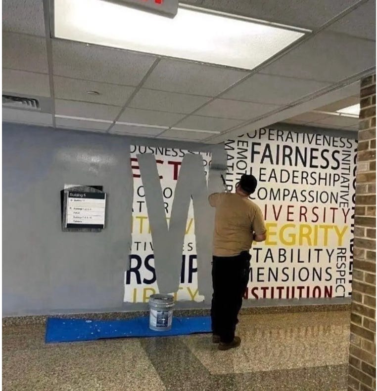 It is not limited to images of diversity. The word “diversity” itself, and “fairness” are too dangerous to survive, painted over to avoid offending the new administration. (“Leadership”, “compassion” and “integrity” are also no longer welcome at the FBI).