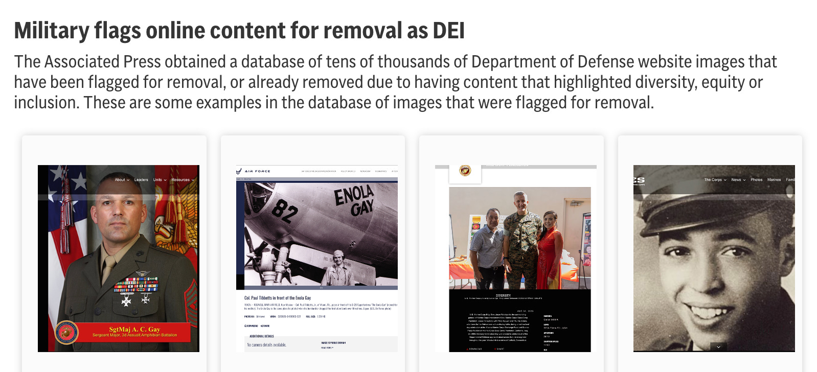 In the Pentagon, about 26,000 images have already been flagged for removal and could lead to up to 100,000 images being cut on military websites. Videos of the World War II Tuskegee airmen were removed from the Air Force. After public pushback, the Trump administration restored the content and complained about “malicious compliance” —but how exactly are bureaucrats supposed to know which images of non-white soldiers are acceptable, and which are DEI?