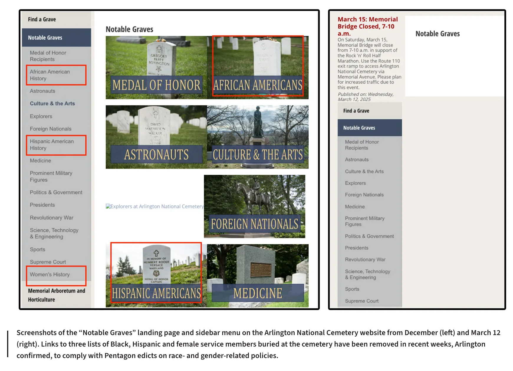A government website guide to Arlington Cemetery has removed materials to identify the graves of Hispanic or Black soldiers. Teaching guides and walking guides to Medal of Honors winners that mention Black soldiers who were initially denied the award on racial grounds were also removed. Modules on women’s history in the military are also gone.