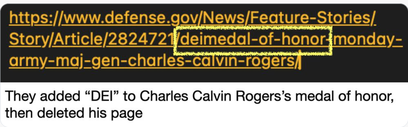 Army Major General Charles Calvin Rogers had been featured in a series Medal of Honor Monday which honors Medal of Honor winners. His page was removed, however, with the new web address for the erased webpage added “DEI” to the url.
