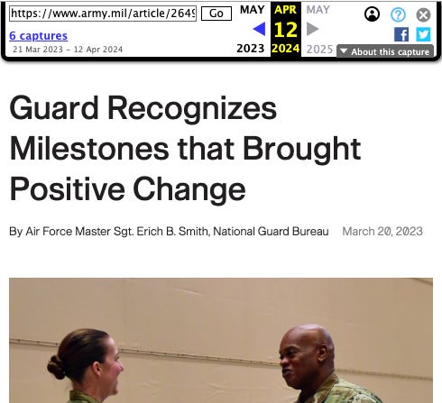 A page honoring Colin Powell has been removed and relabeled as DEI. Pages discussing racial integration of the military have been cut.