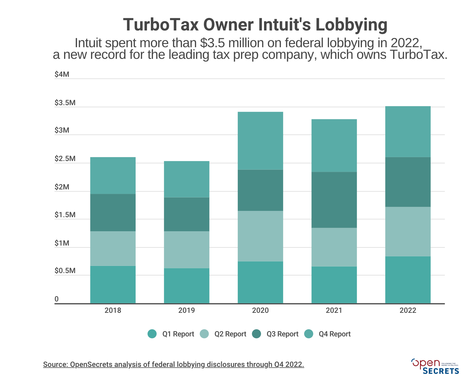 Intuit, the maker of TurboTax, is spending more than ever on lobbying, topping out at $3.5 million in federal spending in 2022. This is just the latest stage in a multi-decade campaign to stop the federal government — and state governments — from making tax reporting easier.2